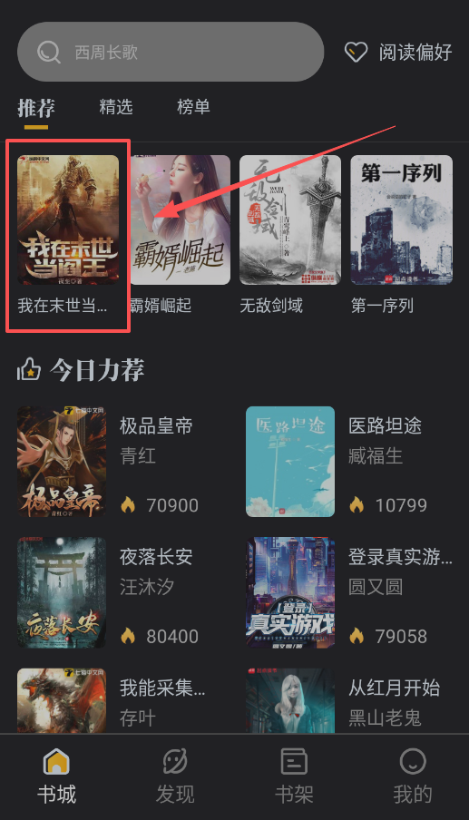1、打开软件后,主推内容会在“书城”和“发现”页展示,例如第一序列、我在末世当,这些书通常更新及时,点开就能读,非常直接。