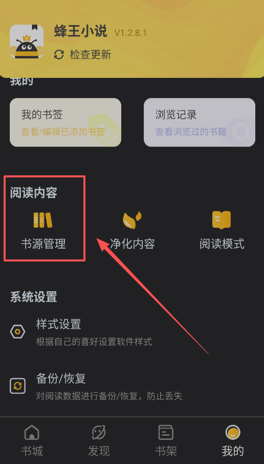 3、扩展书源是关键步骤,前往“我的”>“书源管理”,里面有玄幻奇幻、都市言情等分类下的多个站点,像蚂蚁阅读,添加后找书更容易。