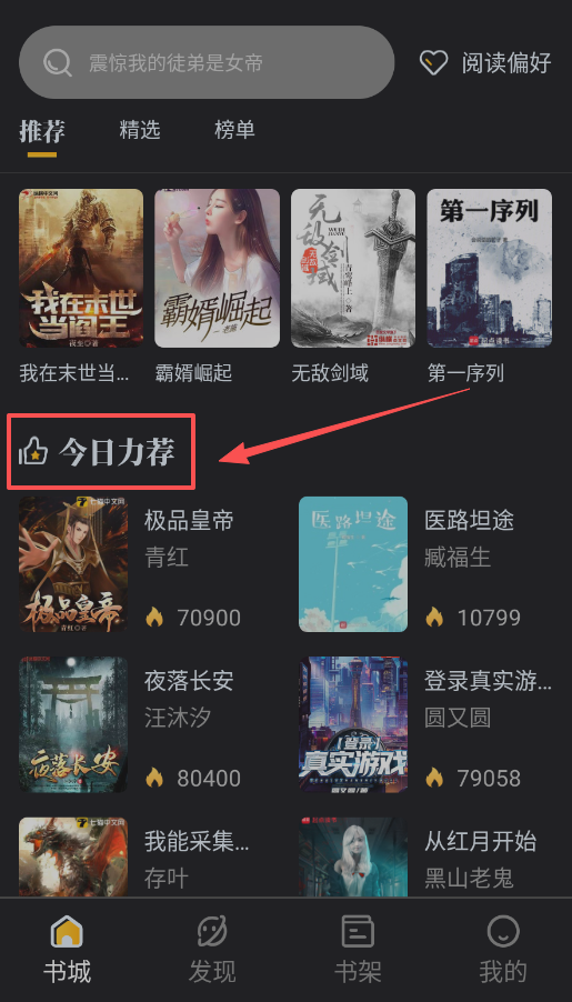 1、在应用首页的“书城”或“发现”板块,能看到“今日力荐”和各类榜单,像九天斩神诀、医路坦途这类书,找书很轻松。
