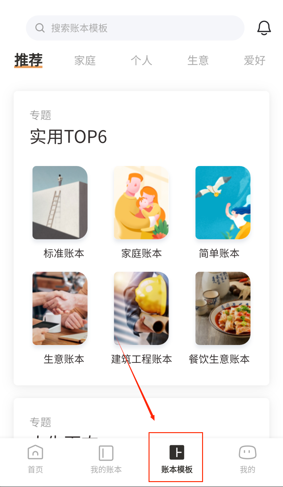 3、在账本模板页面可以看到推荐、家庭、个人等分类,实用TOP6专区有标准账本、家庭账本等模板。
