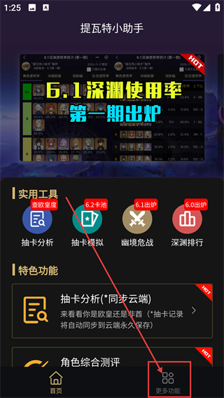 1、在提瓦特小助手指首页点击底部的【更多功能】选项,就能进入功能集合页面,找到各类辅助工具啦。