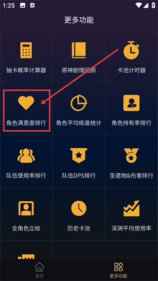 2、进入更多功能页面后,点击【角色满意度排行】选项,就能查看角色的满意度评分数据啦。