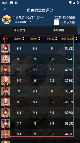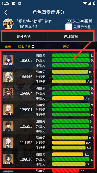 4、切换到【详细数据】标签后,可查看角色的强度分-外观分等更细化的排名数据,方便了解角色人气呀。