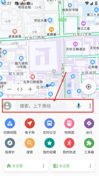 1、在地图首页,点搜索栏可激活输入框,能搜索地点或上下滑动查看更多功能入口哦。