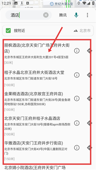 3、输入关键词后,会显示相关地点列表,能看到各地点的距离和地址,方便挑选目标地点呢。