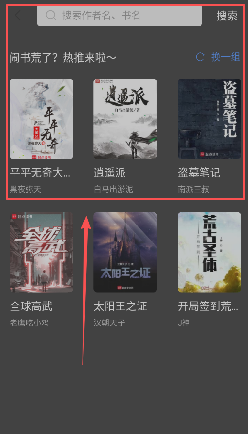 4、遇到书荒,可以使用顶部搜索框直接查找作者或书名,拓展阅读视野。