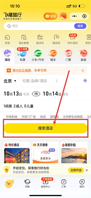 1、我们进入飞猪旅行首页,选好入住时间等信息后,点击【搜索酒店】,就能查找酒店啦。