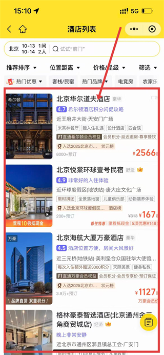 2、搜索后进入酒店列表页面,能看到北京华尔道夫酒店等多家酒店,若有想订的,点击进入酒店详情页。