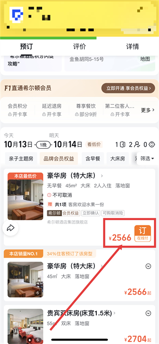 3、进入酒店详情页,选择好房型,比如豪华房(特大床),点击对应的预订按钮。