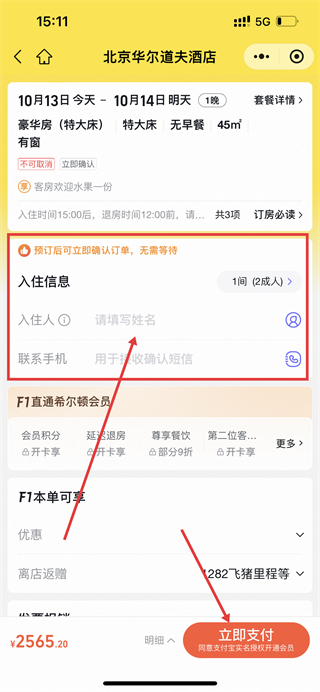 4、点击后进入预订页面,填写入住人姓名、联系手机等信息,然后点击【立即支付】完成预订。
