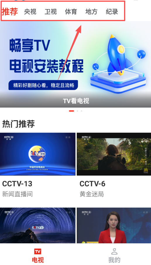 2、浏览频道很简单,直接切换顶部的央视、卫视、体育等标签,系统会推荐CCTV-13新闻或CCTV-6电影等热门内容供你选择。