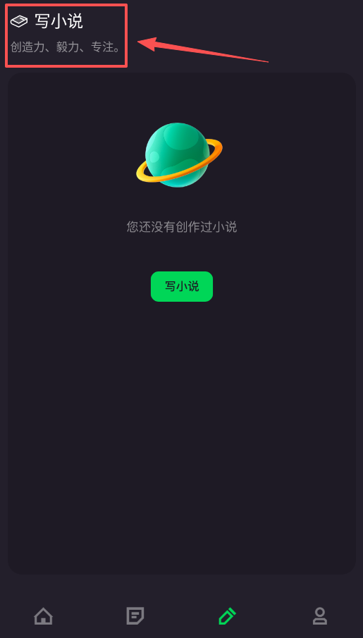 1、打开软件后,在主页可以看到“写小说”的核心入口,上面标注了创造力、毅力、专注这些写作关键词。