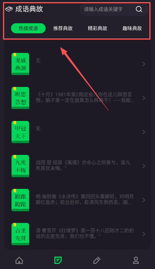 3、在写作时如果需要灵感或查阅资料,可以试试“成语典故”功能,顶部能输入成语关键字搜索。