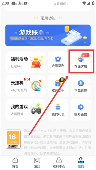 2、在个人界面点击【在线客服】,可进入客服中心,咨询游戏问题啦。