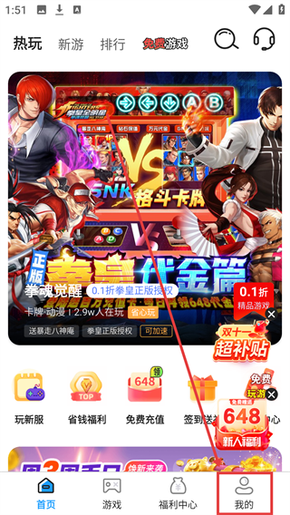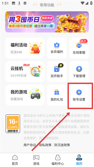 1、在游戏平台首页点击【我的】,进入个人中心可找到账号设置等功能哦。