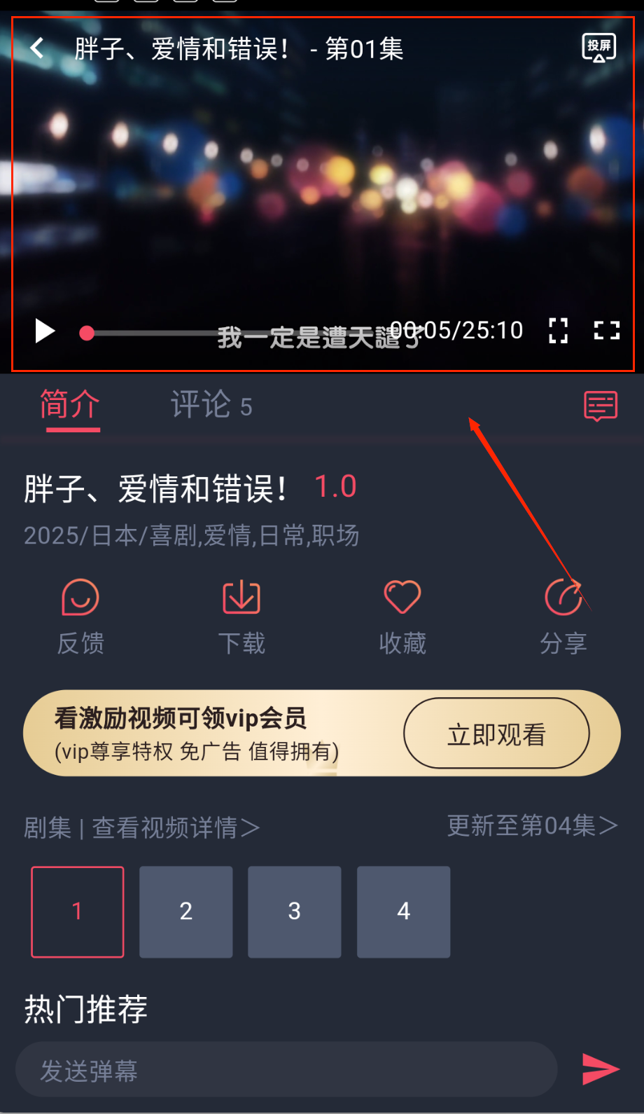 2、然后就可以在播放页面看看简介和大家的评价了,点击屏幕中间的播放按钮,然后看一段小广告,就可以开始看番剧了。
