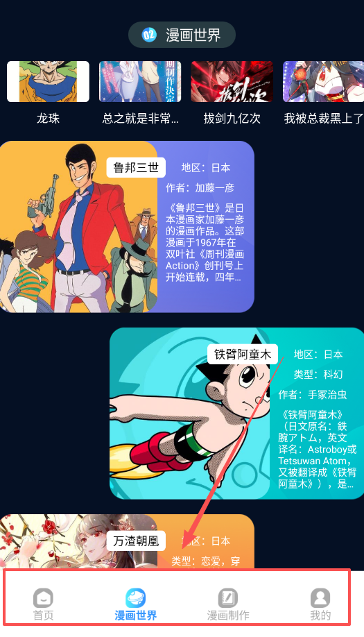2、当你想淘到好漫画时,请进入漫画世界板块,在龙珠、拔剑九亿次等海量作品中,通过查阅详细信息来发掘你的下一本最爱。