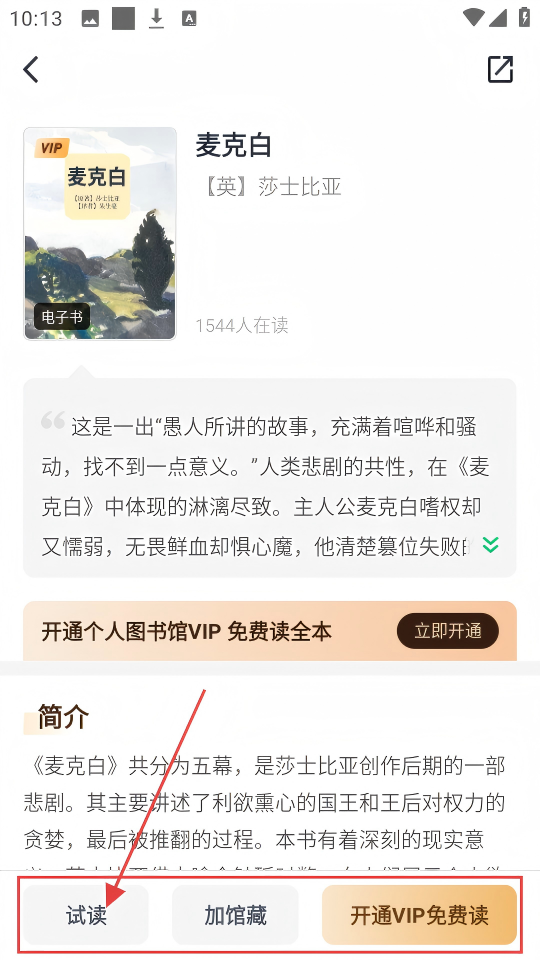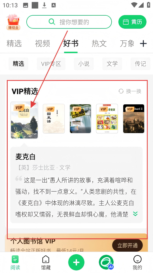 2、进入后,能看到【VIP精选】等好书推荐,找到感兴趣的书籍,比如【麦克白】。