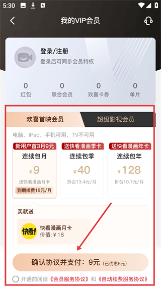 3、在会员开通页选合适的套餐后,勾选协议并点支付按钮,就能完成会员开通流程啦。