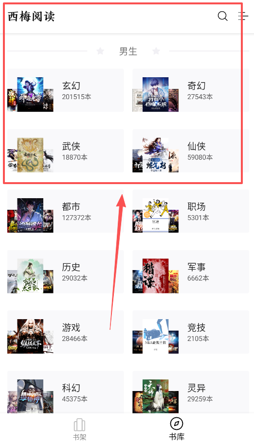 2、进入书库后,你会发现小说按“男生”、“女生”等大类划分,其下又细分为玄幻、奇幻、武侠等众多子类别。