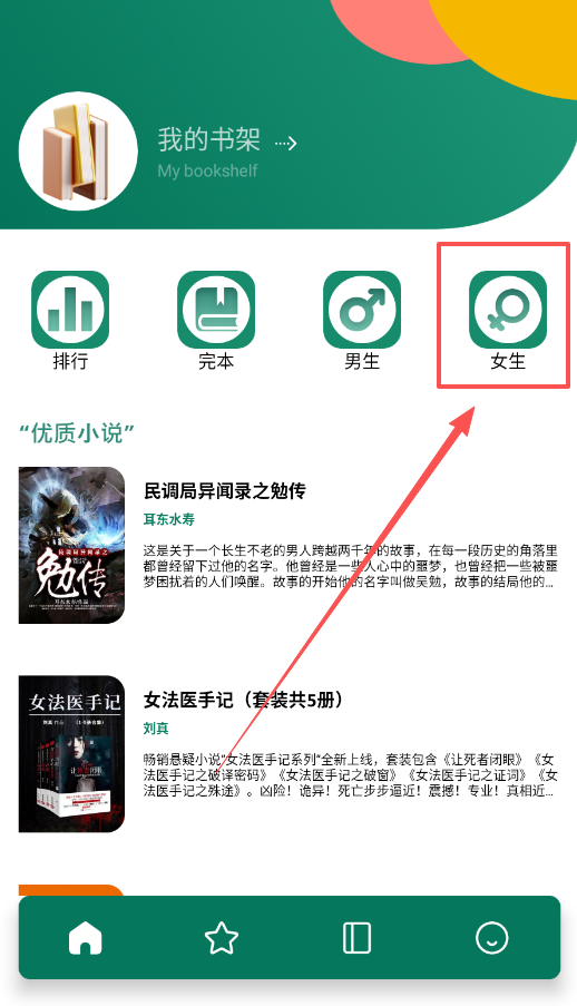 1、主界面顶部是我的书架和分类导航,你可以点完本或女生标签快速过滤,像民调局异闻录这类书会显示简介。