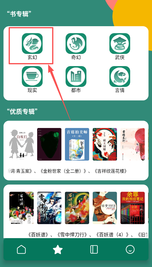 2、探索书专辑区域能发现更多好书,那里按玄幻、现实等类型划分,等优质专辑推荐,点击标签即可浏览对应书单呀。