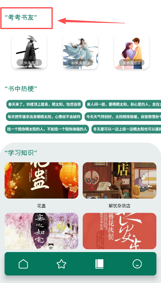 3、休息时可以看看考考书友和书中热梗板块,参与武侠仙侠的趣味问答,或者读读书友分享的晒太阳小句子,轻松一下嘛。
