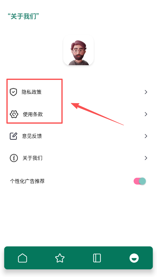 4、别忘了关于我们页面,那里有使用条款和隐私设置,你可以提交意见反馈,也能管理个性化广告,让软件体验更贴心啦。