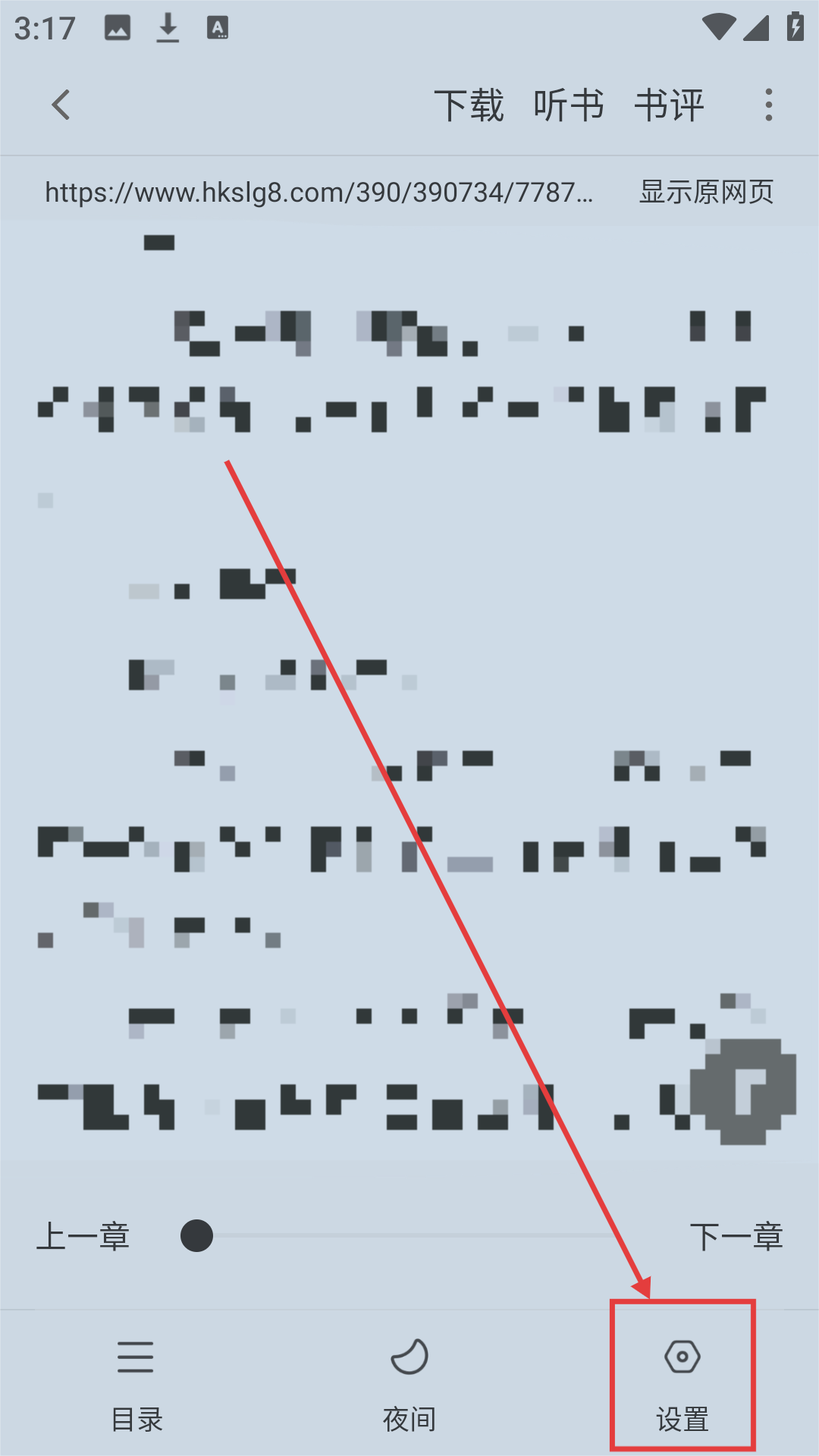 3、进入阅读页面后,点击【设置】,可展开阅读设置选项,准备调整翻页设置啦。