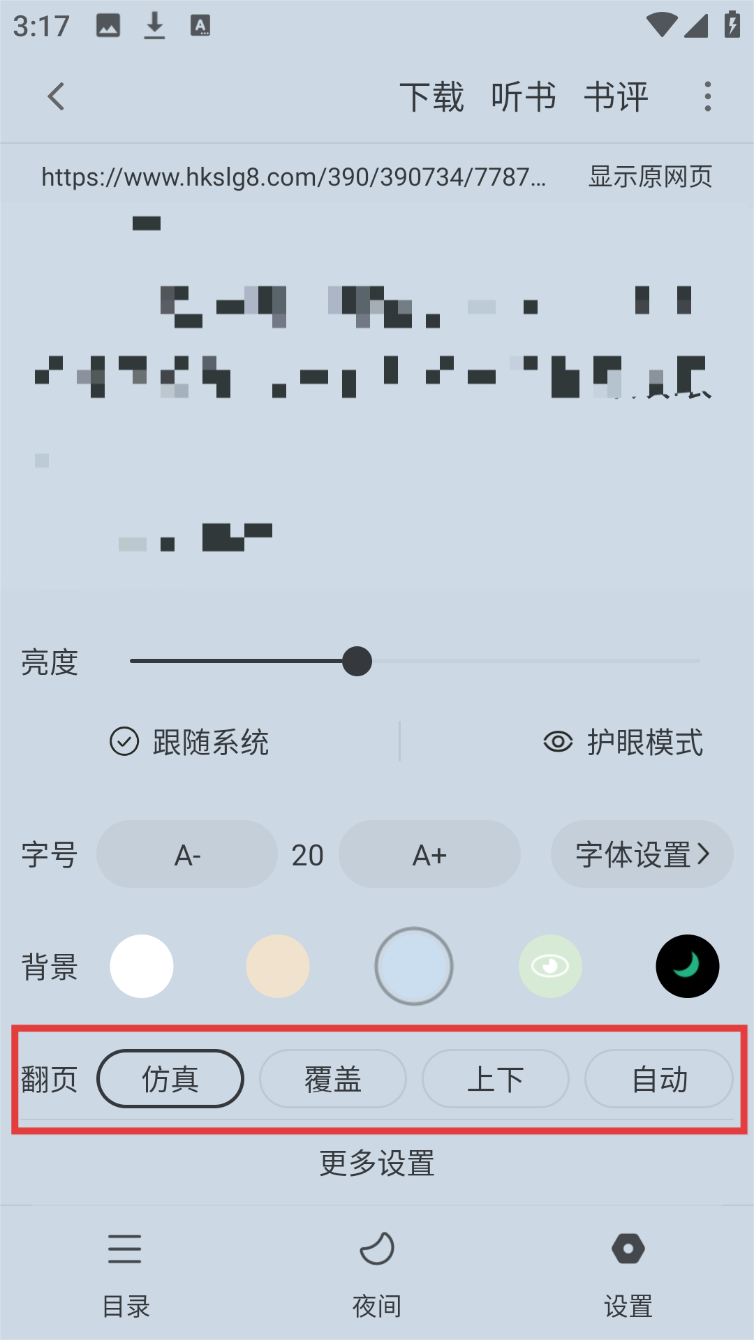 4、在阅读设置中,找到翻页区域,可选择仿真、覆盖等翻页方式,让阅读体验更贴合习惯哦。