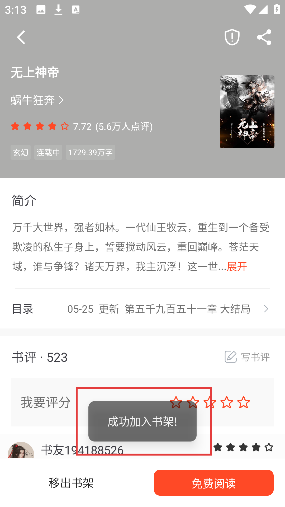 3、加入书架后,会提示“成功加入书架”,这样就完成收藏了呢。