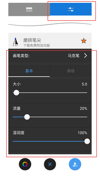 3、选好笔刷后点设置按钮,能调整笔刷的【大小】【流量】等参数,让笔触效果更贴合需求啦。