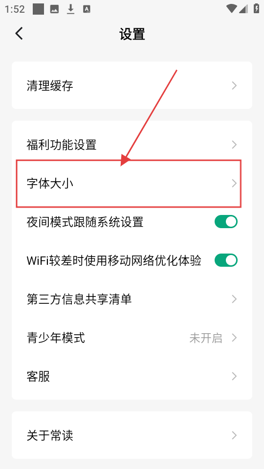 3、在设置页面,找到【字体大小】选项并点击,进入字体大小设置页面,可调整字体大小呢。