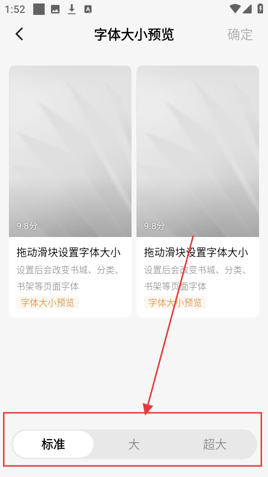 4、在字体大小设置页面,通过选择【标准】【大】【超大】等选项,设置合适字体大小,优化阅读体验啦。