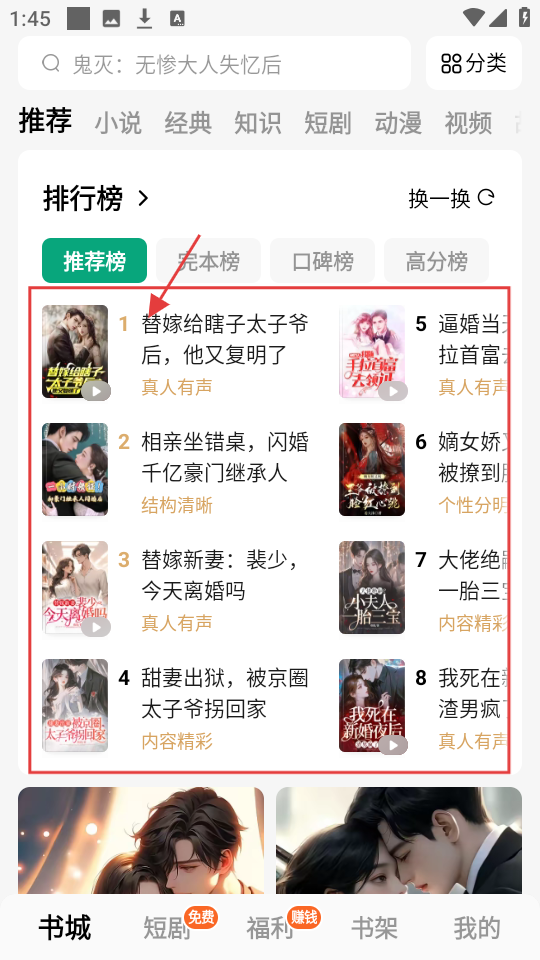 1、在书城推荐榜,选喜欢的作品,比如《替嫁给瞎子太子爷后,他又复明了》,点击进入。