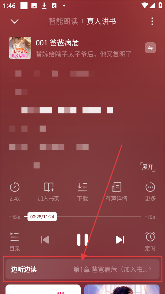 2、进入作品播放页,点击【边听边读】,就能边听音频边看文字,沉浸体验故事。