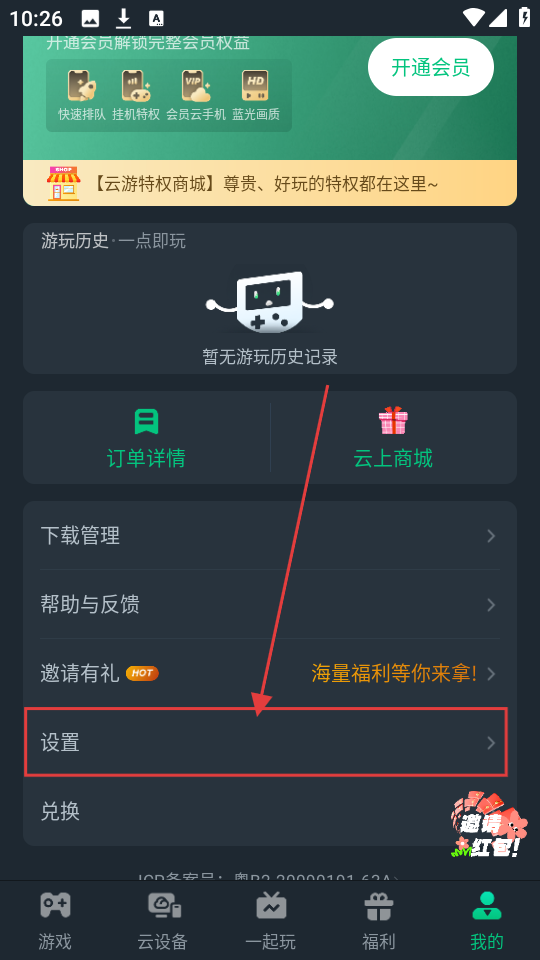 2、在个人页面,找到【设置】选项,点击进入设置界面,以便进行连接虚拟手柄的操作哦。