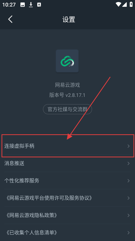 3、在设置界面,找到【连接虚拟手柄】选项,点击它,进入连接虚拟手柄的设置页面啦。