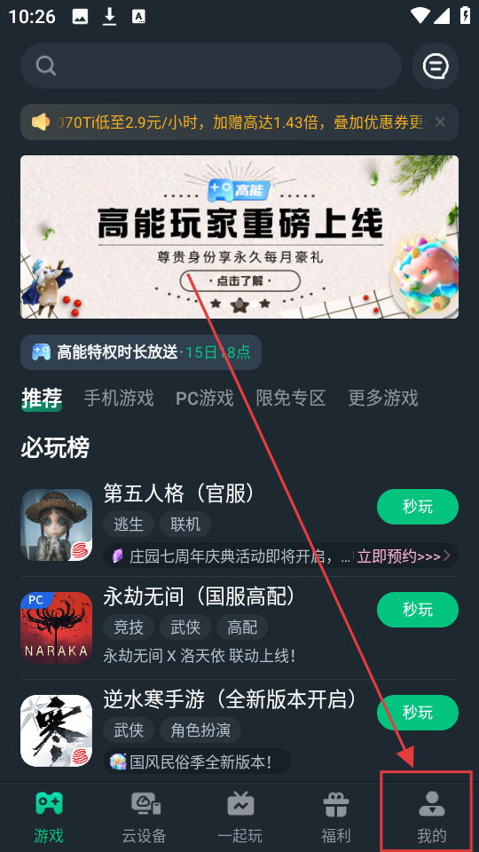 1、首先将网易云游戏软件下载安装,还没有下载的玩家可以点击上方的下载链接进行下载,安装完毕之后进入软件内部,点击右下角“我的”;