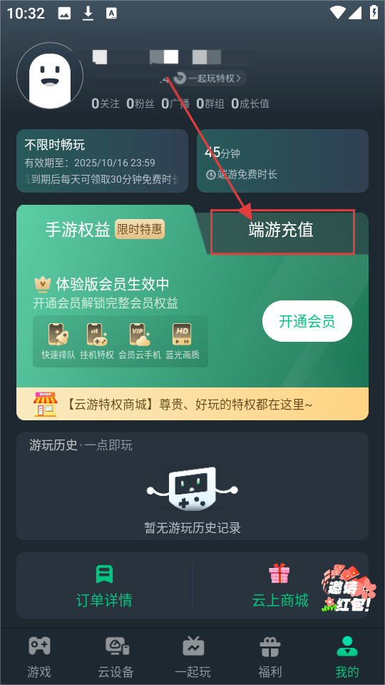 1、打开网易云游戏进入个人中心,找到手游权益,点击“开通会员”。