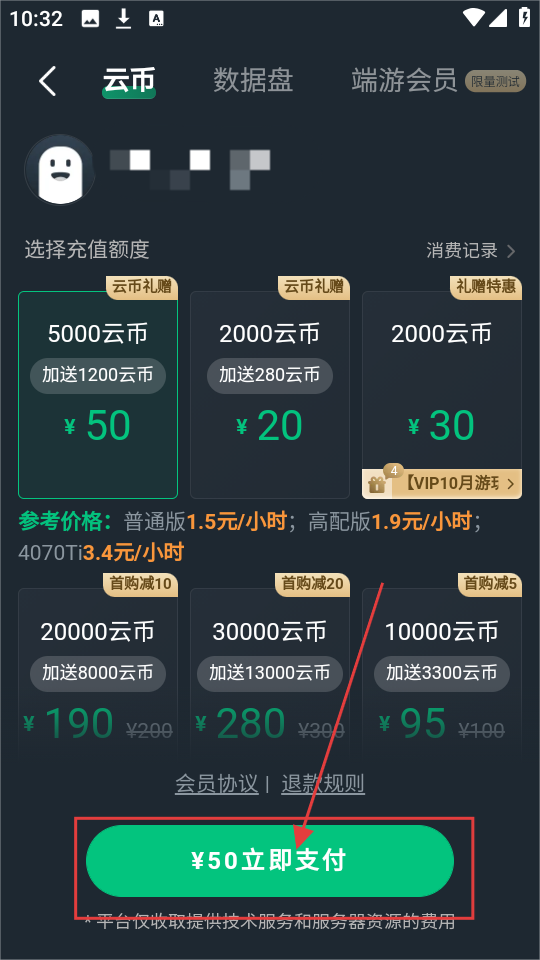 4、进入充值金额选择页面,选好金额后,点击下方对应支付按钮,便可完成充值啦。
