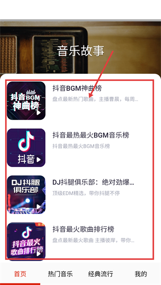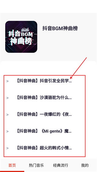 1、进入首页后,选择【抖音BGM神曲榜】这类音乐榜单,就能查看对应主题的热门音乐内容啦。