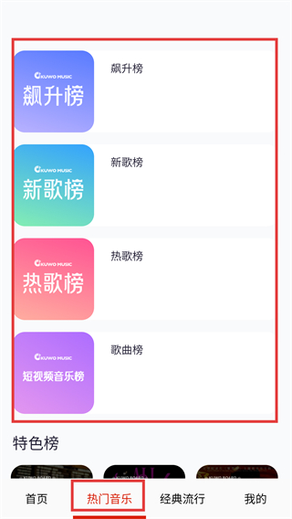 4、切换到【热门音乐】标签页,可看到【飙升榜】【新歌榜】等分类榜单,方便挑选不同类型的热门音乐哦。