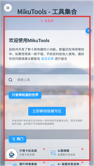 1、在MikuTools首页点击左上角的菜单按钮,就能展开侧边栏,找到各类功能入口啦。