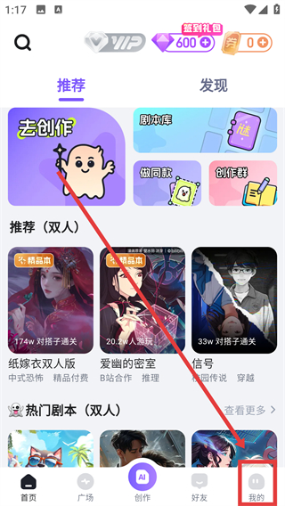 1、在首页点击底部【我的】选项,就能进入个人中心页面,查看自己的剧本收藏、通关记录等信息啦。