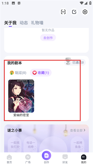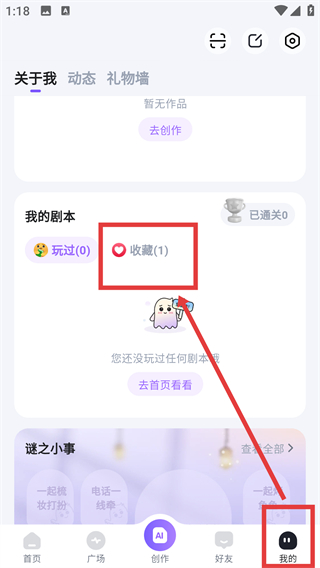 3、在个人中心的【我的剧本】板块点击【收藏(1)】选项,就能查看自己收藏过的剧本列表啦。