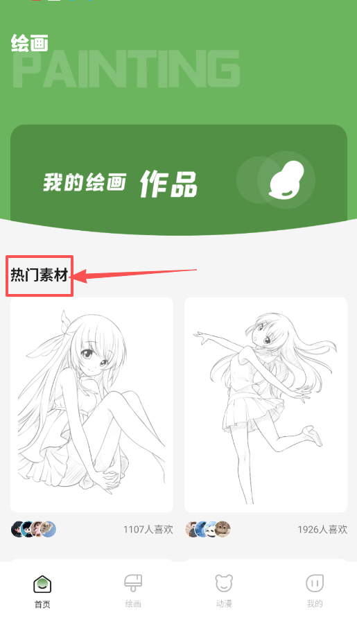 2、“绘画”页不仅是作品库,更是灵感社区。多观察“热门素材”里哪些作品点赞高,分析它们受欢迎的原因,并应用到自己的画作中。
