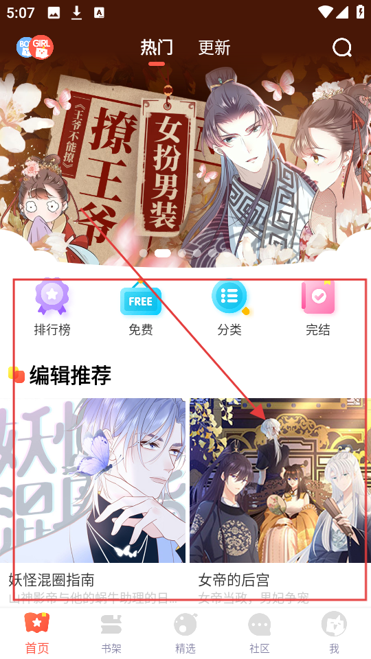 1、在首页的编辑推荐区域,有很多有趣的漫画,比如【女帝的后宫】,点击它就能进入漫画详情页啦。