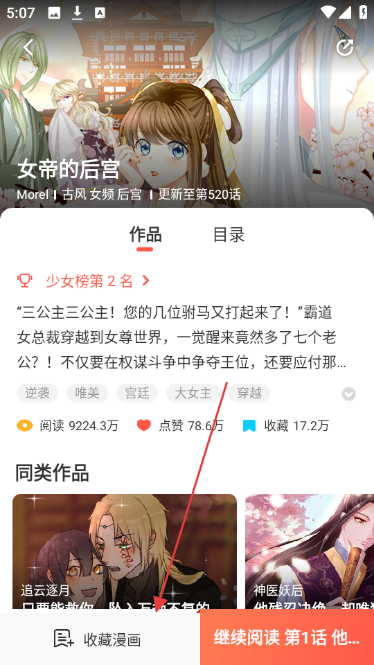 2、进入【女帝的后宫】漫画详情页后,能看到【收藏漫画】按钮,点击它就可以收藏这部漫画啦。
