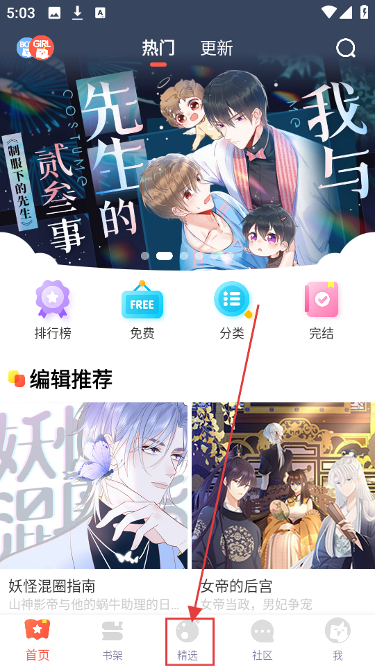 1、我们在软件首页,能看到热门漫画推荐等内容,点击底部的【精选】,就能进入精选页面啦。